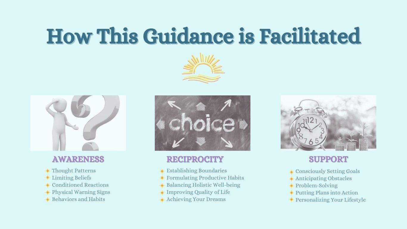 How This Guidance is Facilitated - AWARENESS. Thought Patterns. Limiting Beliefs. Conditioned Reactions. Physical Warning Signs. Behaviors and Habits. RECIPROCITY. Establishing Boundaries. Formulating Productive Habits. Balancing Holistic Well-being. Improving Quality of Life. Achieving Your Dreams. SUPPORT. Consciously Setting Goals. Anticipating Obstacles. Problem-Solving. Putting Plans into Action. Personalizing Your Lifestyle.