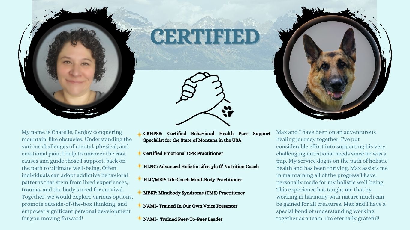 CERTIFIED. My name is Chatelle, and I enjoy conquering mountain-like obstacles. Understanding the various challenges of mental, physical, and emotional pain, I help to uncover the root causes and guide those I support, back on the path to ultimate will-being. Often individuals can adopt addictive behavioral patterns that stem from lived experiences, trauma, and the body's need for survival. Together, we would explore various options, promote outside-of-the-box thinking, and empower significant personal development for you moving forward! CBHPSS: Certified behavioral health peer support specialist for the state of Montana in the USA. Certified Emotional CPR Practitioner. HLNC: Advanced Holistic lifestyle & nutrition coach. HLC/MBP: Life coach mind-body practitioner. MBSP: Mind body syndrome (TMS) practitioner. NAMI - Trained in our own voice presenter. NAMI - Trained Peer-to-Peer leader. Max and I have been on an adventurous healing journey together. I've put considerable effort into supporting his very challenging nutritional needs since he was a pup. My service dog is on the path of holistic health and has been thriving. Max assists me in maintaining all of the progress I have personally made for my holistic well-being. This experience has taught me that by working in harmony with nature, much can be gained for all creatures. Max and I have a special bond of understanding working together as a team. I'm eternally grateful!